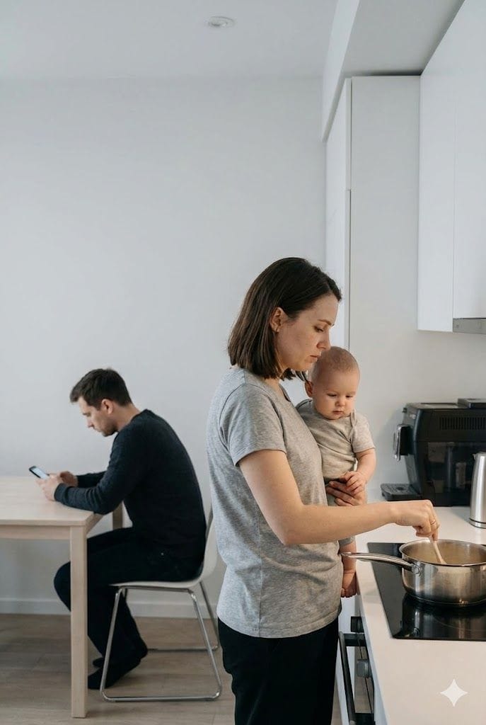 På utsiden var alt normalt. Han var der. Tingene hans sto i gangen, skoene hans ved siden av mine. Men når babyen gråt, var det automatisk «mitt» ansvarsområde.